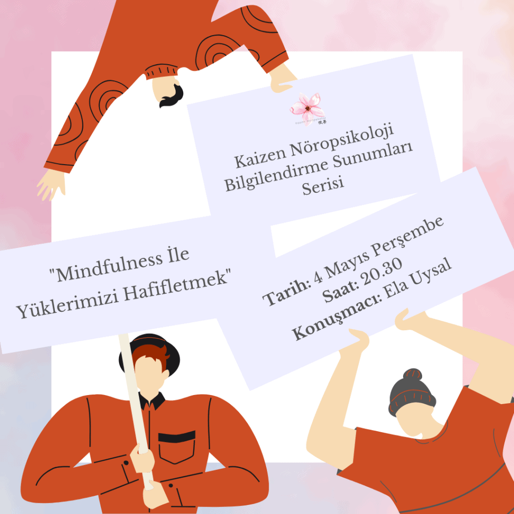 Kaizen Nöropsikoloji olarak bilgi birikimini arttırmak amaçlı alanında uzman kişiler ile gerçekleştireceğimiz ücretsiz etkinliklerimize Mindfulness Eğitmeni Ela UYSAL‘ın konuşmacı olacağı “Mindfulness İle Yüklerimizi Hafifletmek” etkinliği ile devam ediyoruz!